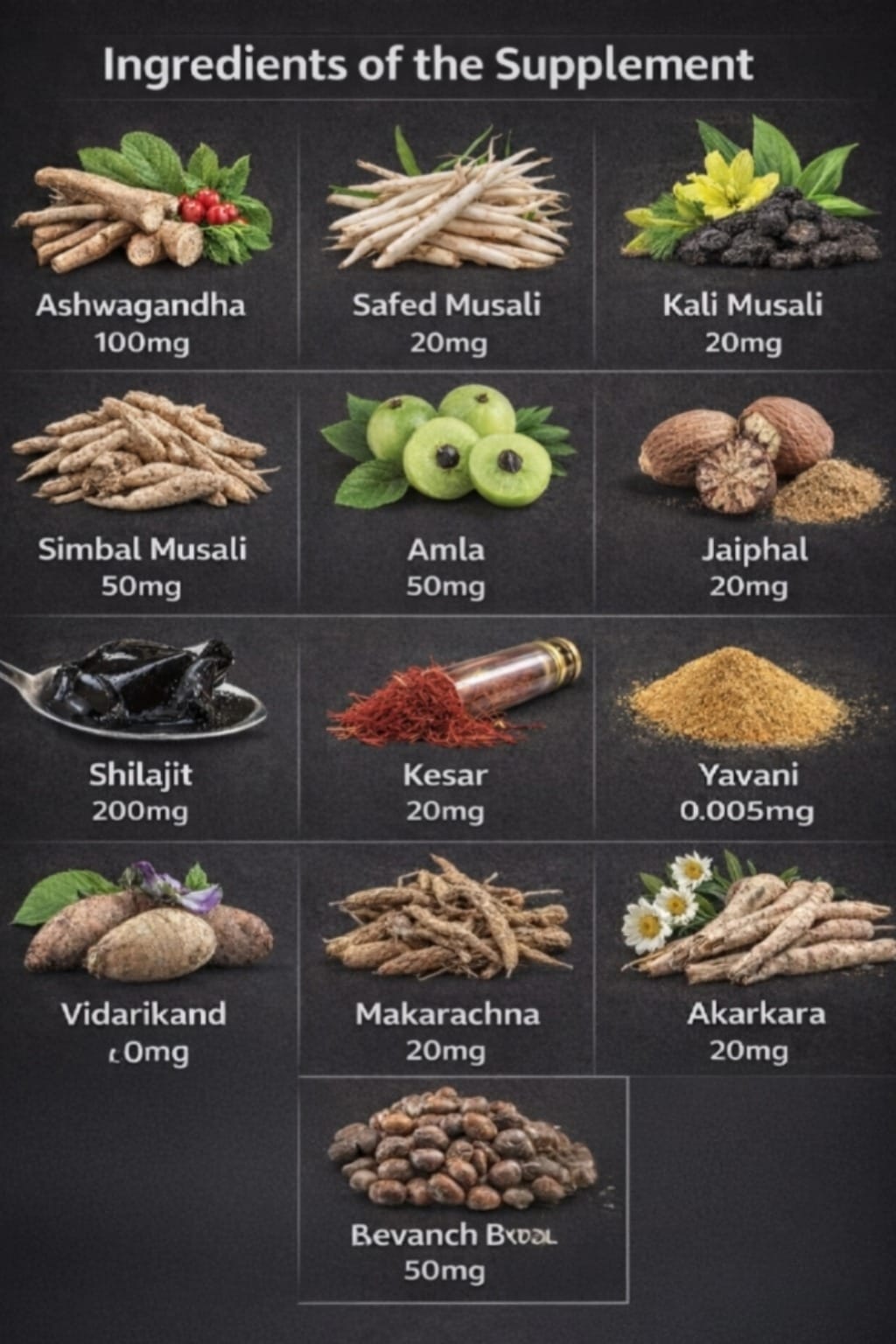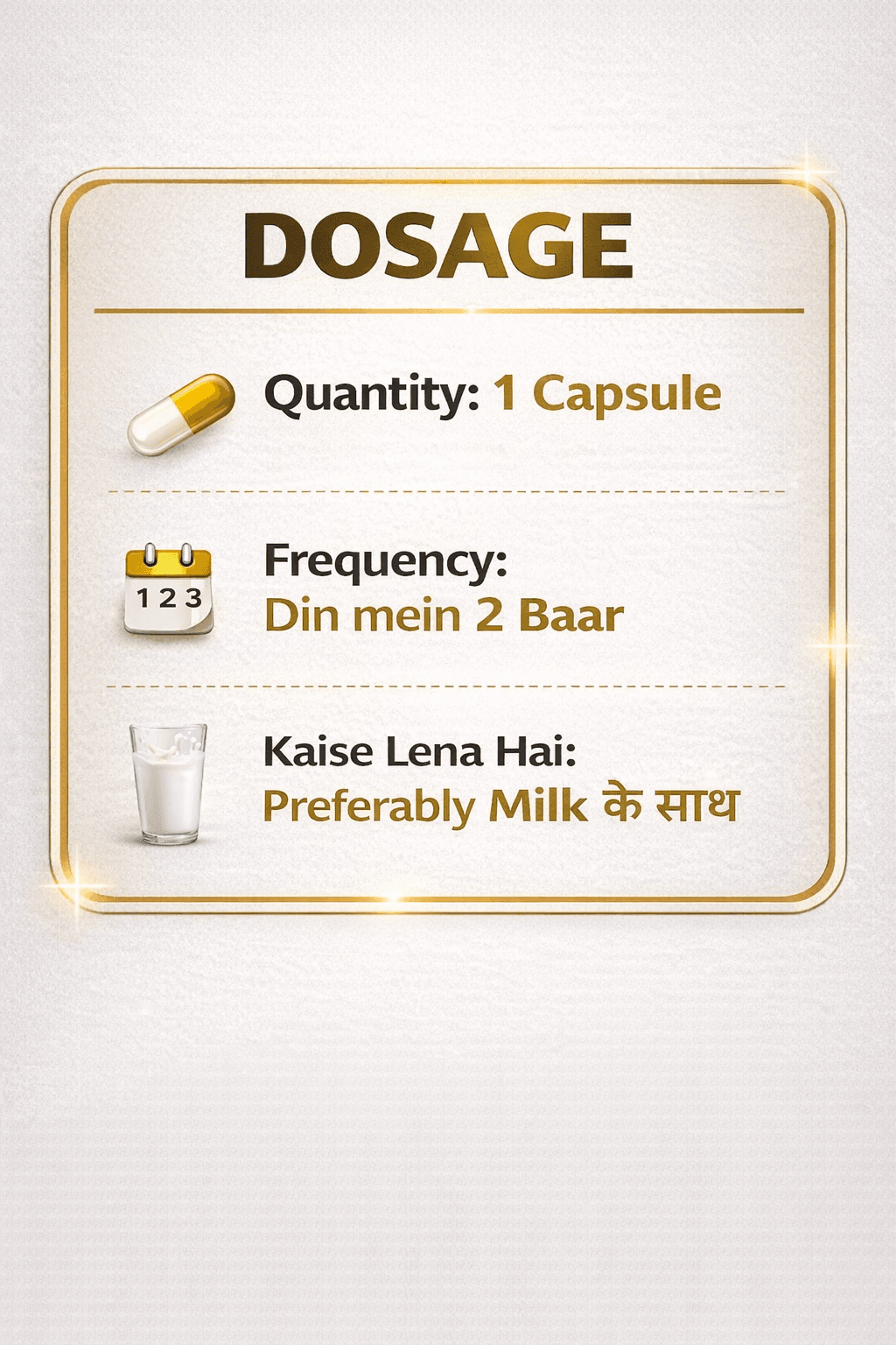 The herbal capsules are prepared using traditional Ayurvedic ingredients that are commonly used to support strength, vitality, and internal balance. Regular use may help maintain daily energy levels and support an active routine.