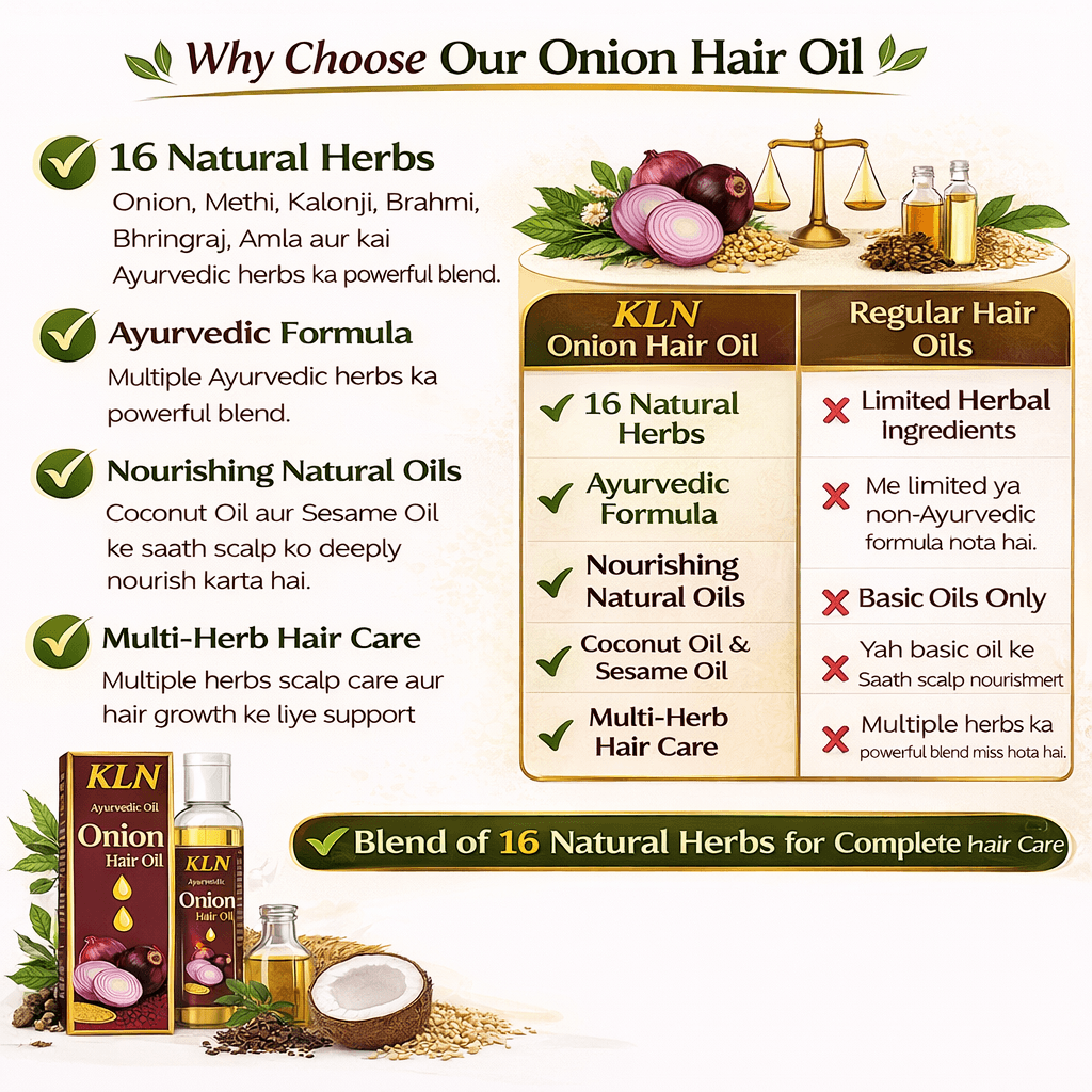 Herbal Onion Hair Oil is an Ayurvedic hair care formulation made with a blend of traditional herbs and botanical ingredients designed to support scalp nourishment and overall hair wellness. This oil combines onion extract with carefully selected herbal oils that are commonly used in traditional hair care practices.