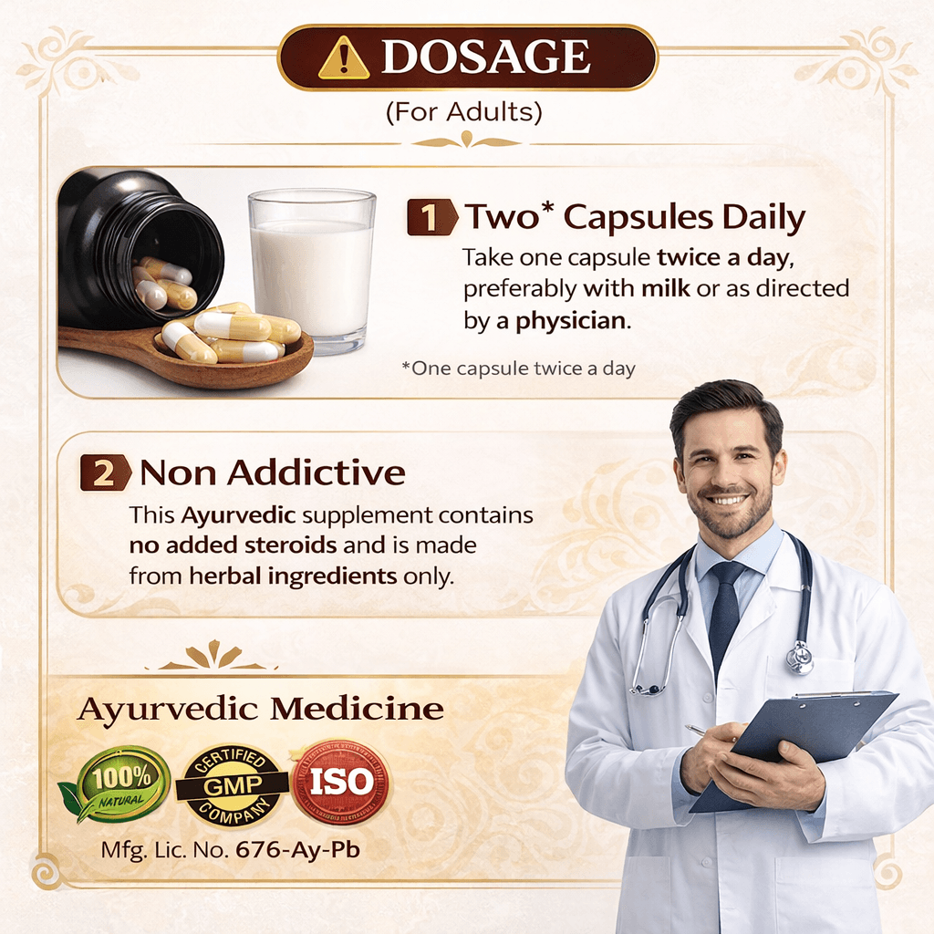 This Ayurvedic herbal supplement contains well-known ingredients such as Ashwagandha, Safed Musli, Shilajit, Amla, Vidarikand, and Kaunch Beej. These herbs are traditionally used in Ayurveda to support strength, endurance, and overall physical vitality.